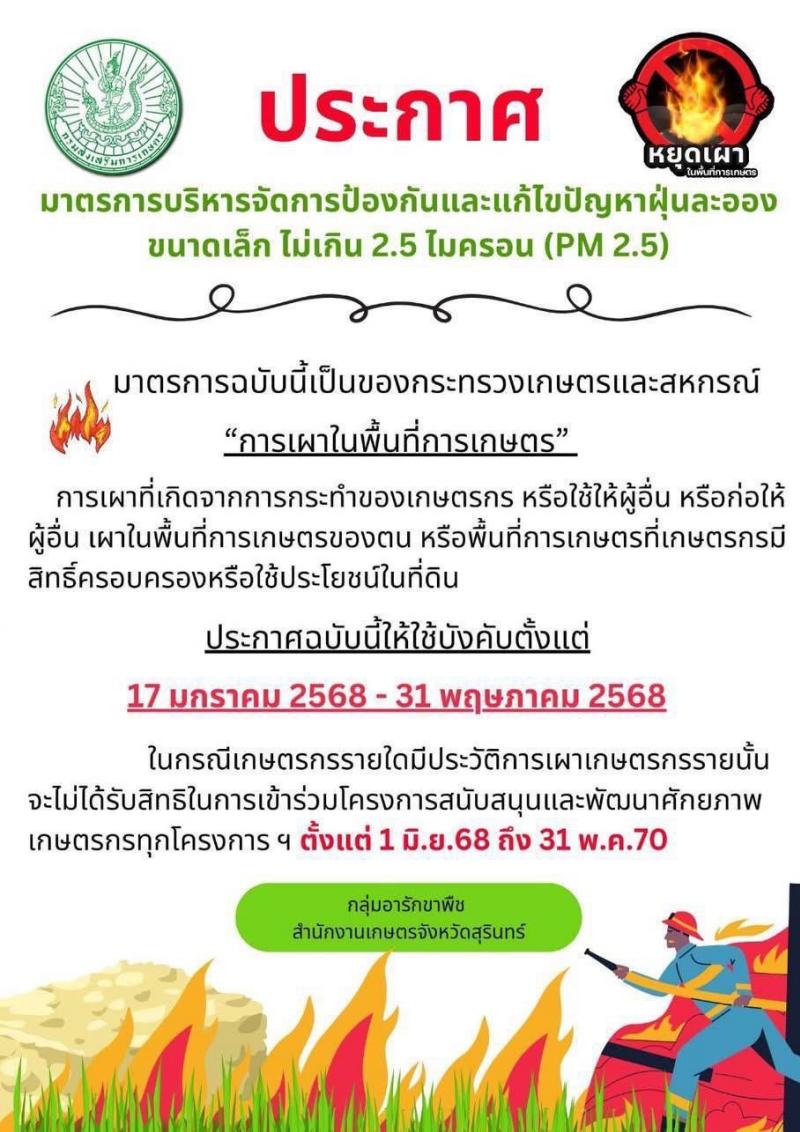 รายละเอียด : ประกาศจังหวัดสุรินทร์ห้ามเผา จนถึงวันที่ 31 พฤษภาคม 2568