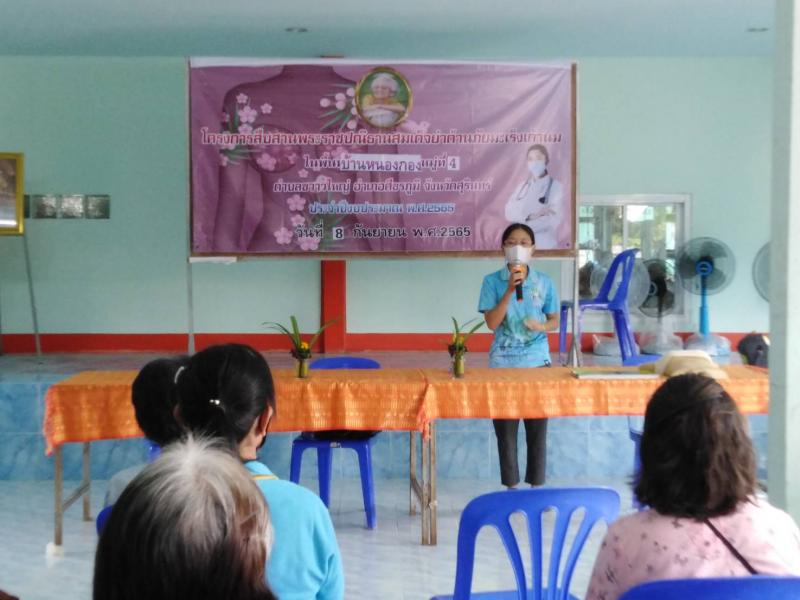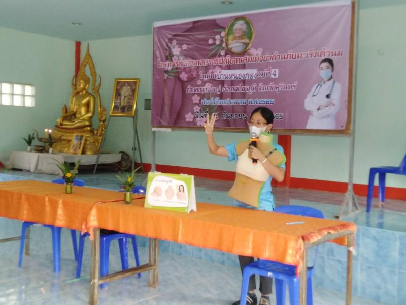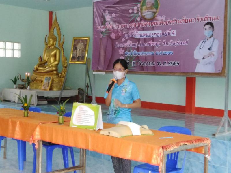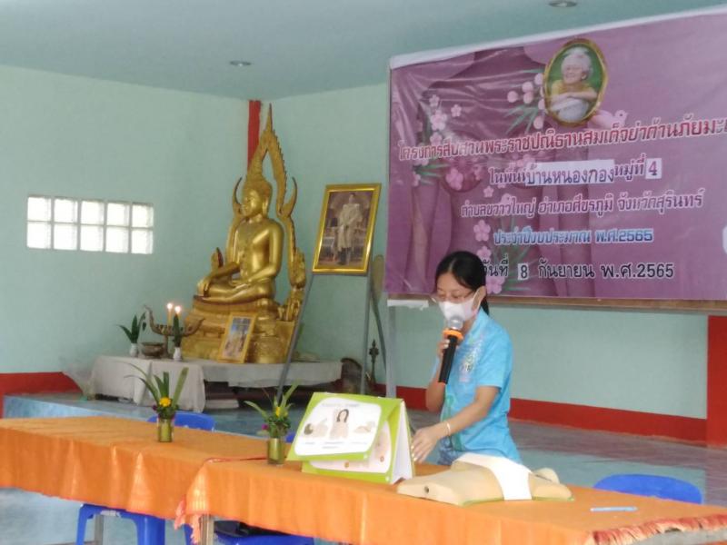โครงการพระราชดำริด้านสาธารณสุข โครงการสืบสานพระราชปณิธานสมเด็จย่าต้านภัยมะเร็งเต้านม บ้านหนองกอง หมู่ที่ 4 ตำบลขวาวใหญ่ อำเภอศีขรภูมิ จังหวัดสุรินทร์ ตามงบประมาณเงินอุดหนุนสำหรับการดำเนินงานตามแนวทางโครงการพระราชดำริด้านสาธารณสุข ประจำปีงบประมาณ พ.ศ.2565