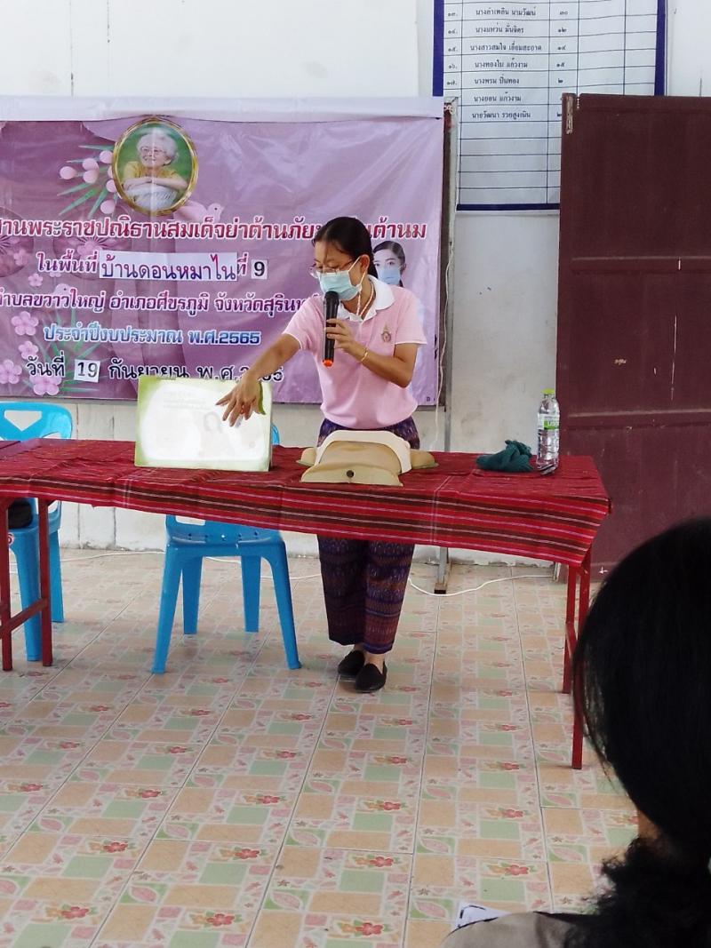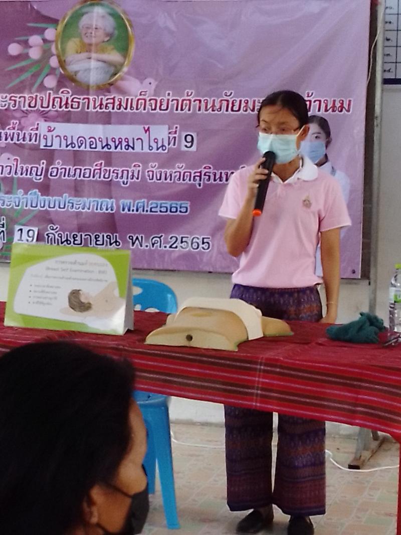 โครงการพระราชดำริด้านสาธารณสุข โครงการสืบสานพระราชปณิธานสมเด็จย่าต้านภัยมะเร็งเต้านม บ้านดอนหมาไน หมู่ที่ 9 ตำบลขวาวใหญ่ อำเภอศีขรภูมิ จังหวัดสุรินทร์ ตามงบประมาณเงินอุดหนุนสำหรับการดำเนินงานตามแนวทางโครงการพระราชดำริด้านสาธารณสุข ประจำปีงบประมาณ พ.ศ.2565