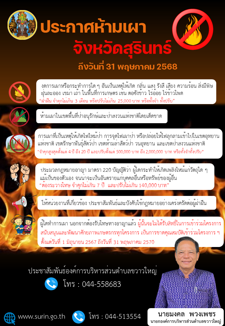 ประกาศ การงดเผา ตามมาตรการจังหวัดสุรินทร์ [6 กุมภาพันธ์ 2568]