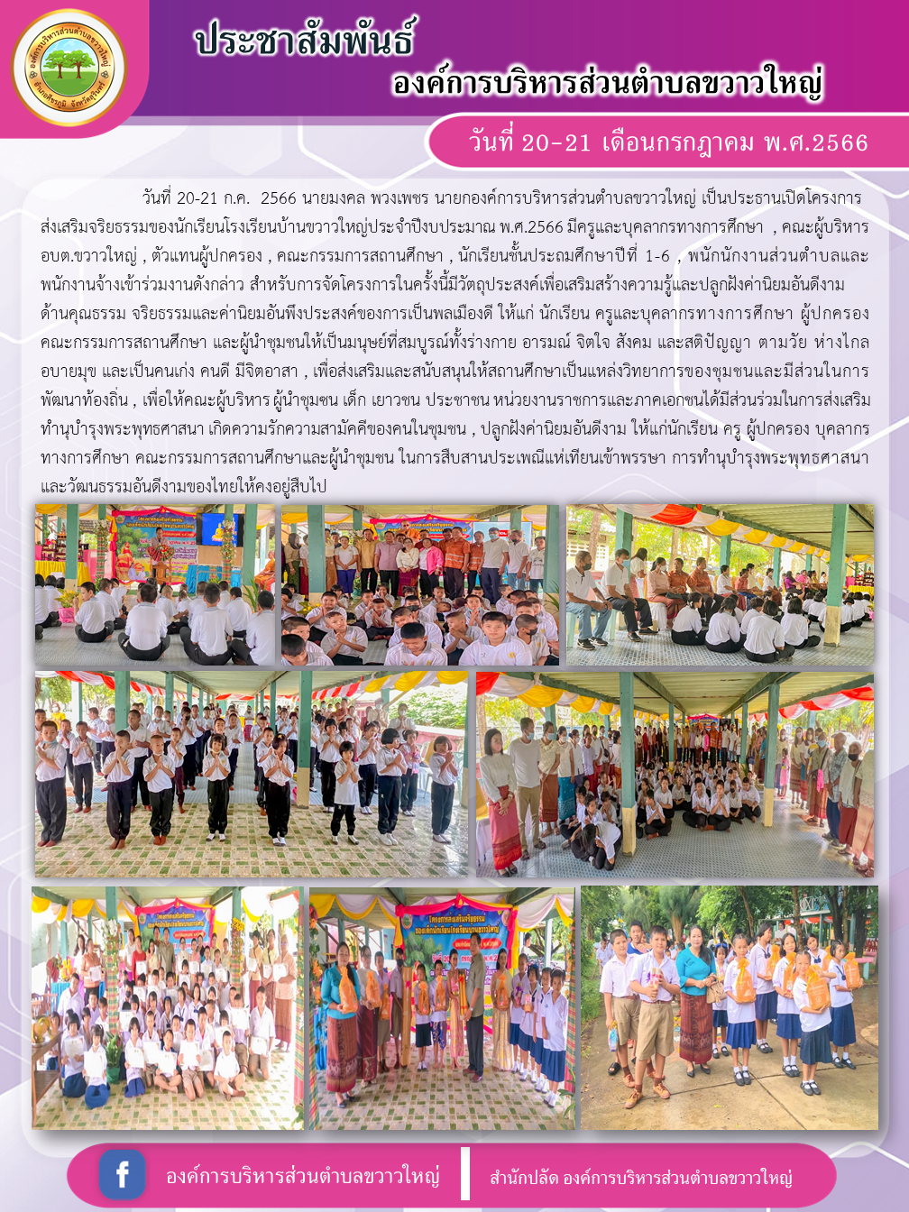 ชื่อเรื่อง : ประชาสัมพันธ์องค์ โครงการ ส่งเสริมจริยธรรมของนักเรียนโรงเรียนบ้านขวาวใหญ่ประจำปีงบประมาณ พ.ศ.2566