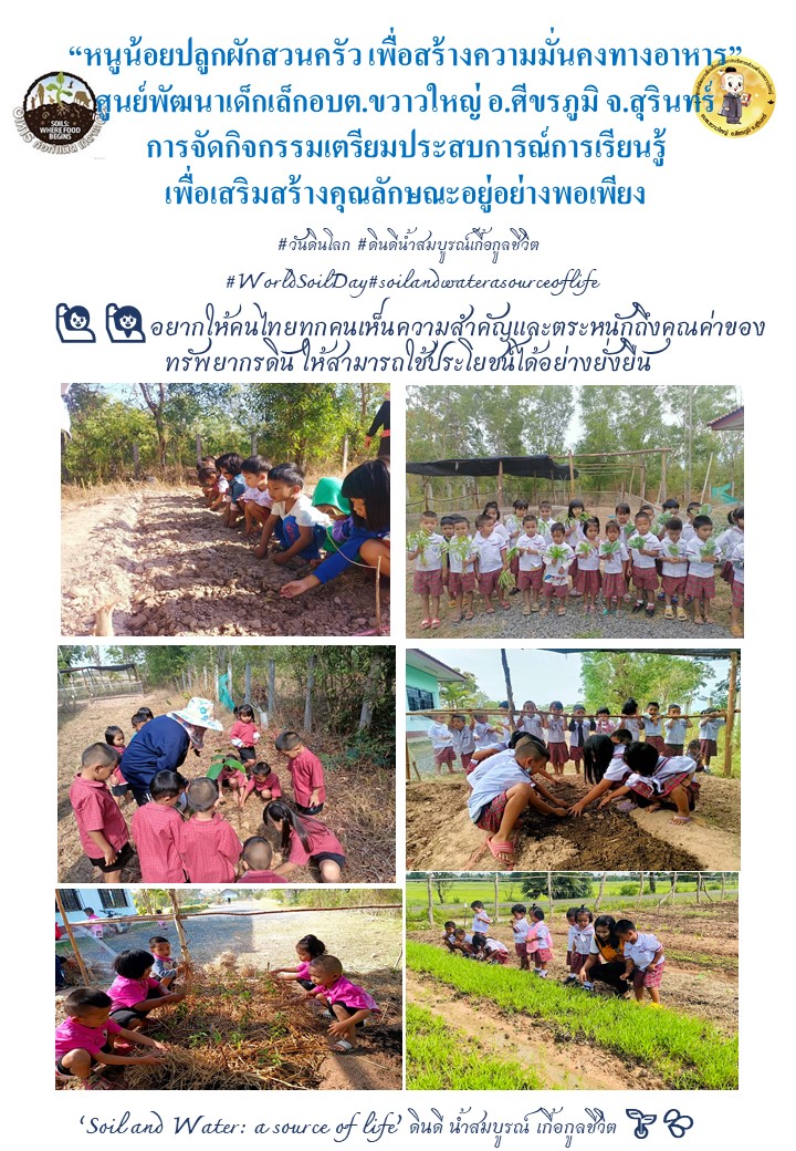 ชื่อเรื่อง : การจัดกิจกรรมสร้างความตระหนักรู้ในการฟื้นฟูและอนุรักษ์ทรัพยากรดิน เนื่องในโอกาสครบรอบ 1 ปี การประกาศเจตนารมณ์ขับเคลื่อนประเทศไทยที่ยั่งยืนในศูนย์พัฒนาเด็กเล็กและโรงเรียนที่จัดการศึกษาระดับปฐมวัยสังกัดองค์กรปกครองส่วนท้องถิ่น