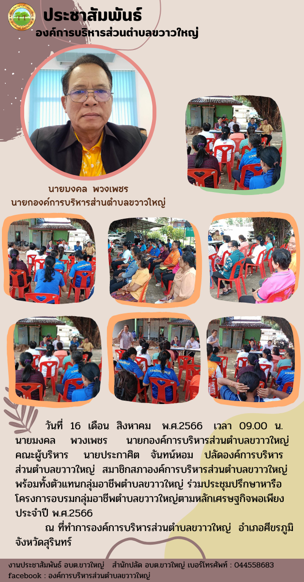 รายละเอียด : วันที่ 16 เดือน สิงหาคม พ.ศ.2566 เวลา 09.00 น. นายมงคล พวงเพชร นายกองค์การบริหารส่วนตำบลขวาวใหญ่ คณะผู้บริหาร นายประกาศิต จันทน์หอม ปลัดองค์การบริหารส่วนตำบลขวาวใหญ่ สมาชิกสภาองค์การบริหารส่วนตำบลขวาวใหญ่ พร้อมทั้งตัวแทนกลุ่มอาชีพตำบลขวาวใหญ่ ร่วมประชุมปรึกษาหารือโครงการอบรมกลุ่มอาชีพตำบลขวาวใหญ่ตามหลักเศรษฐกิจพอเพียง ประจำปี พ.ศ.2566 ณ ที่ทำการองค์การบริหารส่วนตำบลขวาวใหญ่ อำเภอศีขรภูมิ จังหวัดสุรินทร์