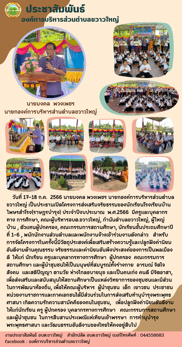 รายละเอียด : วันที่ 17-18 ก.ค. 2566 นายมงคล พวงเพชร นายกองค์การบริหารส่วนตำบลขวาวใหญ่ เป็นประธานเปิดโครงการส่งเสริมจริยธรรมของนักเรียนโรงเรียนบ้านไพษรสำโรง(ราษฎรบำรุง) ประจำปีงบประมาณ พ.ศ.2566 มีครูและบุคลากร ทาง การศึกษา, คณะผู้บริหารอบต.ขวาวใหญ่, กำนันตำบลขวาวใหญ่, ผู้ใหญ่บ้าน , ตัวแทนผู้ปกครอง, คณะกรรมการสถานศึกษา, นักเรียนชั้นประถมศึกษาปีที่ 1-6 , พนักนักงานส่วนตำบลและพนักงานจ้างเข้าร่วมงานดังกล่าว สำหรับการจัดโครงการในครั้งนี้มีวัตถุประสงค์เพื่อเสริมสร้างความรู้และปลูกฝังค่านิยมอันดีงามด้านคุณธรรม จริยธรรมและค่านิยมอันพึงประสงค์ของการเป็นพลเมืองดี ให้แก่ นักเรียน ครูและบุคลากรทางการศึกษา ผู้ปกครอง คณะกรรมการสถานศึกษา และผู้นำชุมชนให้เป็นมนุษย์ที่สมบูรณ์ทั้งร่างกาย อารมณ์ จิตใจ สังคม และสติปัญญา ตามวัย ห่างไกลอบายมุข และเป็นคนเก่ง คนดี มีจิตอาสา, เพื่อส่งเสริมและสนับสนุนให้สถานศึกษาเป็นแหล่งวิทยาการของชุมชนและมีส่วนในการพัฒนาท้องถิ่น, เพื่อให้คณะผู้บริหาร ผู้นำชุมชน เด็ก เยาวชน ประชาชน หน่วยงานราชการและภาคเอกชนได้มีส่วนร่วมในการส่งเสริมทำนุบำรุงพระพุทธศาสนา เกิดความรักความสามัคคีของคนในชุมชน, เพื่อปลูกฝังค่านิยมอันดีงาม ให้แก่นักเรียน ครู ผู้ปกครอง บุคลากรทางการศึกษา คณะกรรมการสถานศึกษาและผู้นำชุมชน ในการสืบสานประเพณีแห่เทียนเข้าพรรษา การทำนุบำรุงพระพุทธศาสนา และวัฒนธรรมอันดีงามของไทยให้คงอยู่สืบไป