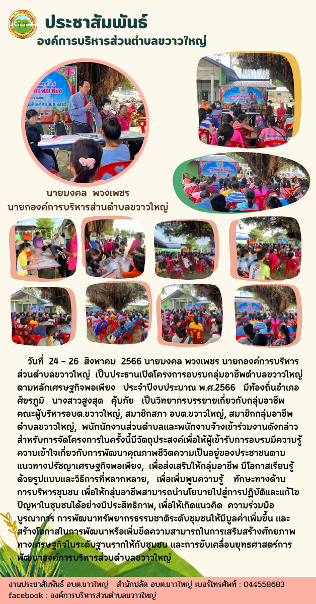 รายละเอียด : โครงการอบรมกลุ่มอาชีพตำบลขวาวใหญ่ตามหลักเศรษฐกิจพอเพียง ประจำปี พ.ศ.2566 ระหว่างวันที่ 24 – 26 เดือนสิงหาคม พ.ศ. 2566 องค์การบริหารส่วนตำบลขวาวใหญ่ อำเภอศีขรภูมิ จังหวัดสุรินทร์