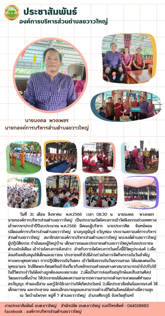 รายละเอียด : โครงการเข้าวัดฟังธรรมช่วงเทศกาลเข้าพรรษา ประจำปีงบประมาณ พ.ศ.2566 วันที่ 31 สิงหาคม พ.ศ.2566 ณ วัดบ้านไพรษร หมู่ที่ 7 ตำบลขวาวใหญ่ อำเภอศีขรภูมิ จังหวัดสุรินทร์ วัตถุประสงค์ 1.เพื่อส่งเสริมสนับสนุนให้เด็กและเยาวชน ประชาชนทั่วไปมีส่วนร่วมในการจัดกิจกรรมในวันสำคัญทางพระพุทธศาสนา การปฏิบัติธรรมในวันพระ เข้าวัดฟังธรรมในวันธรรมสวนะ ได้แสดงตนเป็นพุทธมามกะ ใกล้ชิดพระรัตนตรัยเข้าใจเกี่ยวกับหลักธรรมคำสอนทางศาสนาสามารถนำไปปรับใช้ในชีวิตประจำวันได้อย่างถูกต้องและเหมาะสม 2.เพื่อเป็นการส่งเสริมอนุรักษ์และสืบสานศิลปวัฒนธรรมพื้นบ้าน ให้ประชาชนได้แสดงความสามารถความสามารถด้านการสวดมนต์ทำนอง สรภัญญะ ทำนองอีสาน และรู้จักใช้เวลาว่างให้เกิดประโยชน์ 3.เพื่อประชาสัมพันธ์และรณรงค์ ให้เด็กเยาวชน และประชาชน ลดละเลิกอบายมุขและสามารถดำรงชีวิตในสังคมได้อย่างมีความสุข