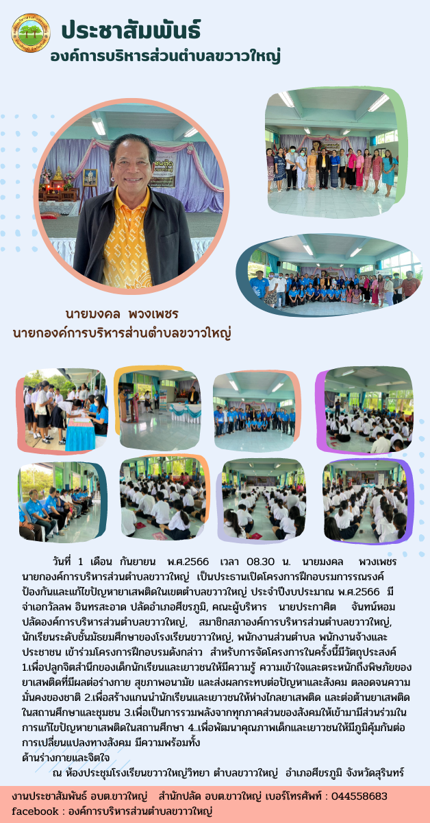 รายละเอียด : โครงการฝึกอบรมการรณรงค์ป้องกันและแก้ไขปัญหายาเสพติดในเขตตำบลขวาวใหญ่ ประจำปีงบประมาณ พ.ศ.2566 วันที่ 1 กันยายน พ.ศ.2566 ณ ห้องประชุมโรงเรียนขวาวใหญ่วิทยา ตำบลขวาวใหญ่ อำเภอศีขรภูมิ จังหวัดสุรินทร์ วัตถุประสงค์ 1.เพื่อปลูกจิตสำนึกของเด็กนักเรียนและเยาวชนให้มีความรู้ ความเข้าใจและตระหนักถึงพิษภัยของยาเสพติดที่มีผลต่อร่างกาย สุขภาพอนามัย และส่งผลกระทบต่อปัญหาและสังคม ตลอดจนความมั่นคงของชาติ 2.เพื่อสร้างแกนนำนักเรียนและเยาวชนให้ห่างไกลยาเสพติด และต่อต้านยาเสพติดในสถานศึกษาและชุมชน 3.เพื่อเป็นการรวมพลังจากทุกภาคส่วนของสังคมให้เข้ามามีส่วนร่วมในการแก้ไขปัญหายาเสพติดในสถานศึกษา 4..เพื่อพัฒนาคุณภาพเด็กและเยาวชนให้มีภูมิคุ้มกันต่อการเปลี่ยนแปลงทางสังคม มีความพร้อมทั้งด้านร่างกายและจิตใจ