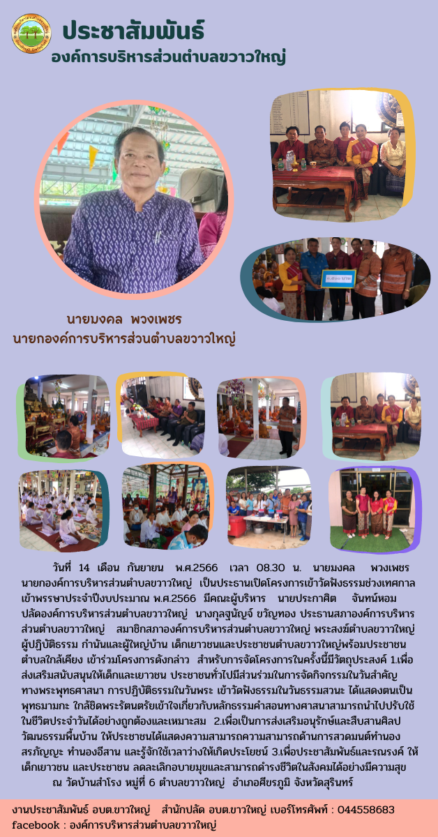 รายละเอียด : โครงการเข้าวัดฟังธรรมช่วงเทศกาลเข้าพรรษา ประจำปีงบประมาณ พ.ศ.2566 วันที่ 14 กันยายน พ.ศ.2566 ณ วัดบ้านสำโรง หมู่ที่ 6 ตำบลขวาวใหญ่ อำเภอศีขรภูมิ จังหวัดสุรินทร์ สำหรับการจัดโครงการในครั้งนี้มีวัตถุประสงค์ 1.เพื่อส่งเสริมสนับสนุนให้เด็กและเยาวชน ประชาชนทั่วไปมีส่วนร่วมในการจัดกิจกรรมในวันสำคัญ ทางพระพุทธศาสนา การปฏิบัติธรรมในวันพระ เข้าวัดฟังธรรมในวันธรรมสวนะ ได้แสดงตนเป็นพุทธมามกะ ใกล้ชิดพระรัตนตรัยเข้าใจเกี่ยวกับหลักธรรมคำสอนทางศาสนาสามารถนำไปปรับใช้ในชีวิตประจำวันได้อย่างถูกต้องและเหมาะสม 2.เพื่อเป็นการส่งเสริมอนุรักษ์และสืบสานศิลปวัฒนธรรมพื้นบ้าน ให้ประชาชนได้แสดงความสามารถความสามารถด้านการสวดมนต์ทำนอง สรภัญญะ ทำนองอีสาน และรู้จักใช้เวลาว่างให้เกิดประโยชน์ 3.เพื่อประชาสัมพันธ์และรณรงค์ ให้เด็กเยาวชน และประชาชน ลดละเลิกอบายมุขและสามารถดำรงชีวิตในสังคมได้อย่างมีความสุข ณ วัดบ้านสำโรง หมู่ที่ 6 ตำบลขวาวใหญ่ อำเภอศีขรภูมิ จังหวัดสุรินทร์