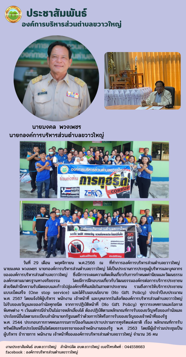 ชื่อเรื่อง : นายมงคล พวงเพชร นายกองค์การบริหารส่วนตำบลขวาวใหญ่ พร้อมด้วยเจ้าหน้าที่ และบุคลากรองค์การบริหารส่วนตำบลขวาวใหญ่ ประกาศนโยบายไม่รับของขวัญและของกำนัล ทุกชนิดจากการปฏิบัติหน้าที่ (No Gift Policy)