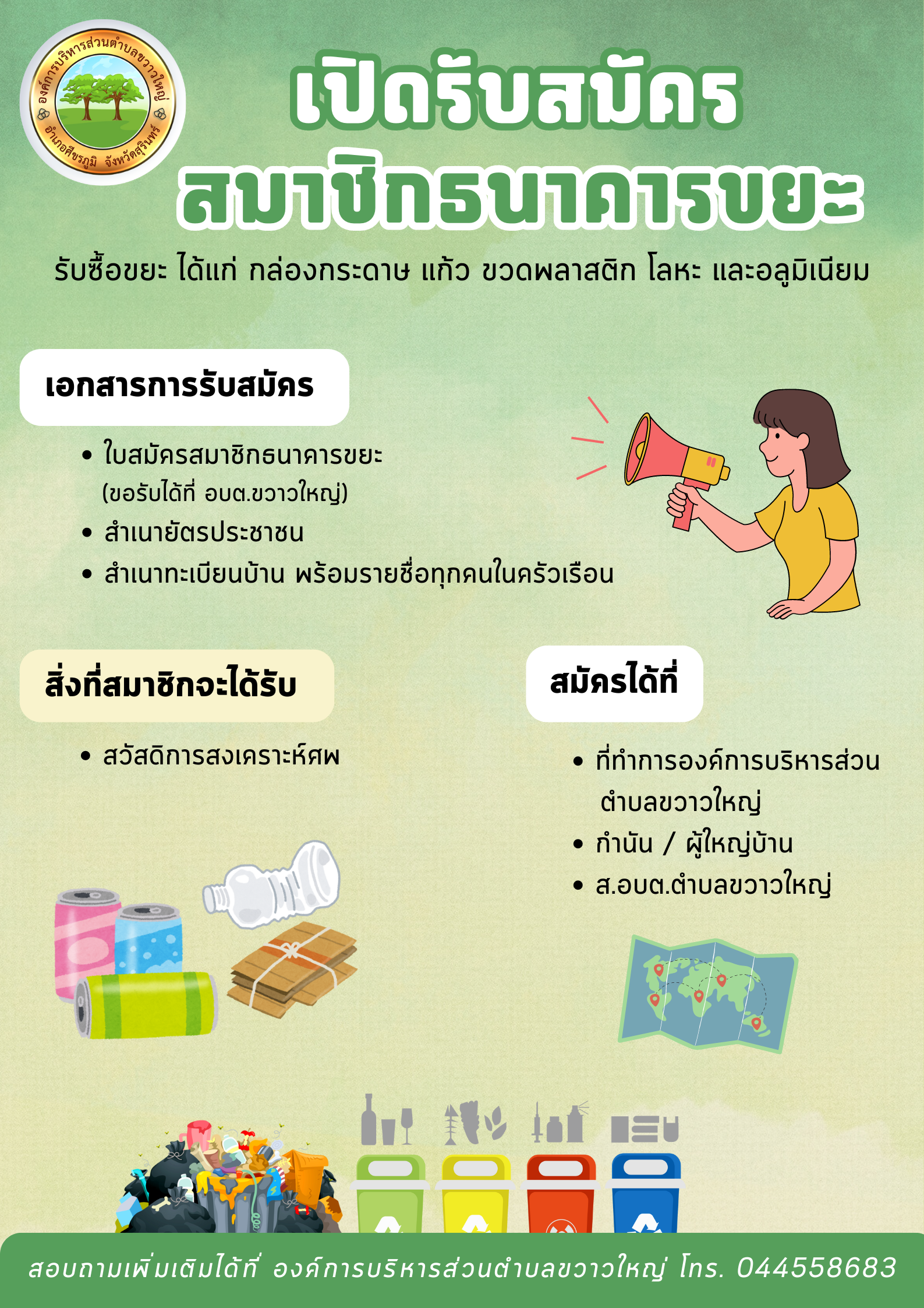รายละเอียด : แจ้งประชาสัมพันธ์การรับสมัครสมาชิก ของกองทุนธนาคารขยะ อบต.ขวาวใหญ่ ประชาสัมพันธ์เชิญชวนให้ประชาชนทั่วไป สมัครเป็นสมาชิกโครงการธนาคารขยะ ณ จุดรับซื้อขยะศาลาประชาคมหมู่บ้าน ทั้ง 9 หมู่บ้าน ที่กำหนดตามแผนการรับซื้อขยะ เพื่อเป็นการลดปริมาณขยะ และคัดแยกขยะมูลฝอยจากต้นทาง ตามหลักการ 3Rs ในการจัดการปัญหาขยะอย่างยั่งยืน โดยส่งเสริมให้ประชาชนได้เข้าร่วมเป็นสมาชิกธนาคารขยะ เพื่อสิทธิประโยชน์ตามกิจกรรม 3 ข คือ 1. ขยะสวยช่วยพัฒนารายได้ 2. ขยะออมทรัพย์ 3. ขยะกองทุนฌาปนกิจ ทั้งนี้ขอเชิญชวนพี่น้องประชาชนในเขตตำบลขวาวใหญ่ ที่สนใจเข้าร่วมสมัครสมาชิกธนาคารขยะ อบต.ขวาวใหญ่ โดยนำเอกสารประกอบการสมัครดังนี้ 1. สำเนาบัตรประจำตัวประชาชนผู้สมัคร 2. สำเนาทะเบียนบ้านภายในครอบครัว **มาร่วมสมัครและเป็นสมาชิกธนาคารขยะ อบต.ขวาวใหญ่กันทุกครัวเรือนนะคะ**
