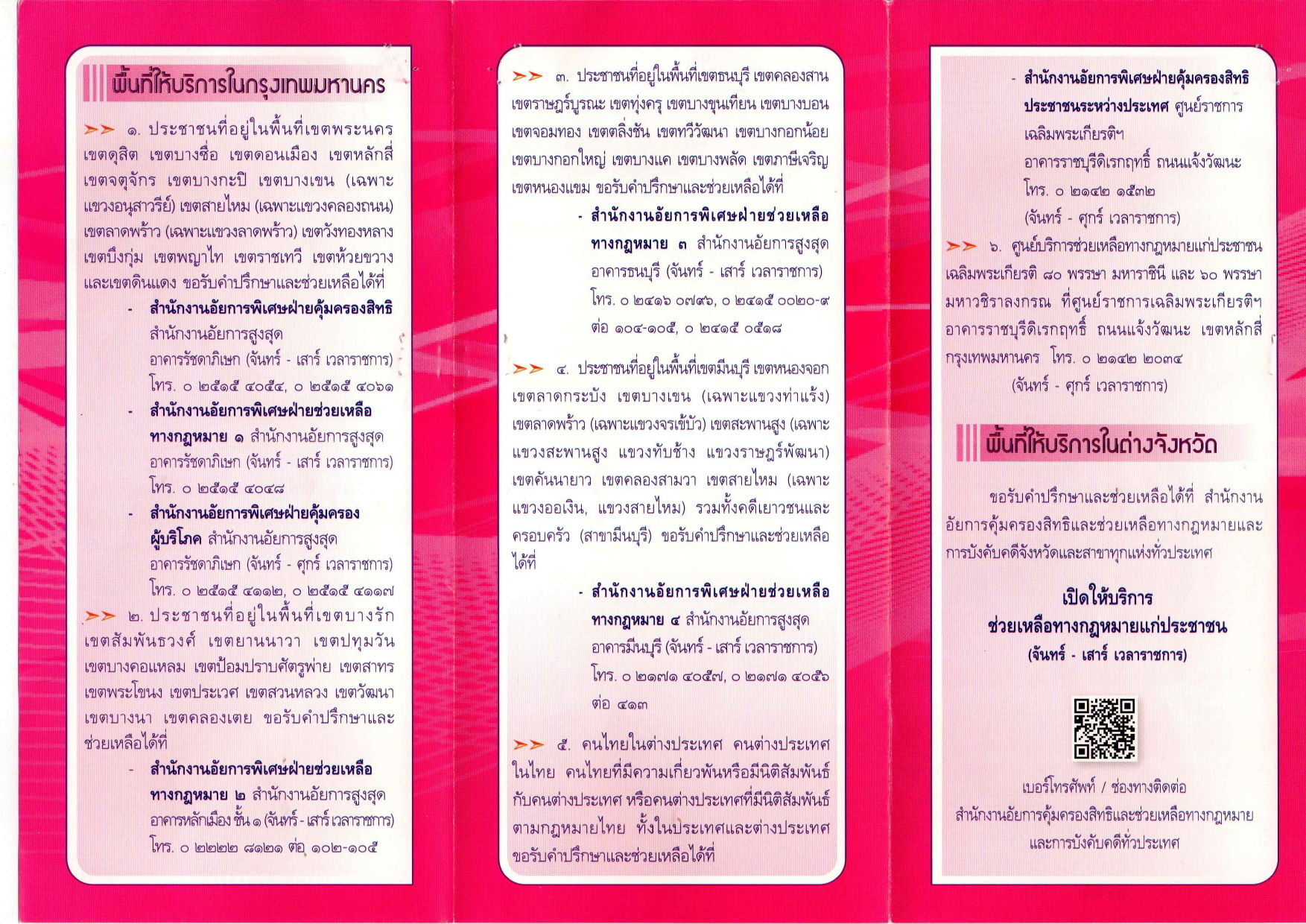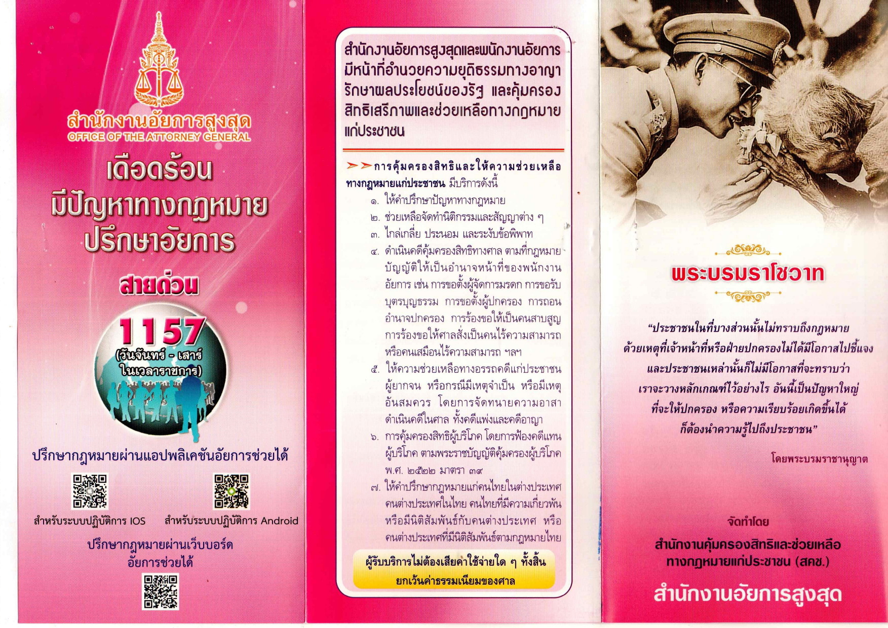 รายละเอียด : ด้วยสำนักงานอัยการคุ้มครองสิทธิและช่วยเหลือทางกฎหมายและการบังคับคดีจังหวัดสุรินทร์ สำนักงานอัยการสูงสุด มีภารกิจในการช่วยเหลือประชาชนในด้านกฎหมาย ได้แก่ การให้คำปรึกษาปัญหาทาง กฎหมายต่าง ๆ การจัดทำนิติกรรมสัญญาต่างๆ การคุ้มครองสิทธิทางศาล เช่น การขอจัดตั้งผู้จัดการมรดก การขอรับบุตรบุญธรรม การให้ความช่วยเหลือทางอรรถคดีแก่ผู้ยากจน และไม่ได้รับความเป็นธรรมโดยจัดทนาย อาสาดำเนินคดีทางศาลให้คำปรึกษาและช่วยเหลือคดีเกี่ยวกับผู้บริโภค ให้คำปรึกษาปัญหาทางกฎหมายแก่คนไทย ในต่างประเทศ และคนไทยในประเทศไทยและภารกิจในการเผยแพรให้ความรู้ทางกฎหมายแก่ประชาชน เป็นต้น โดยในปัจจุบันสำนักงานได้เปิดให้บริการแก่ประชาชนในทุกวันเสาร์ ตั้งแต่เวลา ๑๘.๓๐ - ๑๖.๓๐ น. สำนักงานอัยการคุ้มครองสิทธิและช่วยเหลือทางกฎหมายและการบังคับคดีจังหวัดสุรินทร์ จึงใคร่ขอความอนุเคราะห์จากท่าน ดังนี้ ๑. ประชาสัมพันธ์ภารกิจดังกล่าวข้างต้นของสำนักงานอัยการคุ้มครองสิทธิและช่วยเหลือทาง กฎหมายและการบังคับคดีจังหวัดสุรินทร์ ให้ประชาชนในพื้นที่ได้รับทราบและช้บริการ โดยเฉพาะอย่างยิ่ง การเปิดให้บริการในทุกวันเสาร์ เต็มวัน โดยทุกอย่างเป็นการให้บริการฟรี ไม่มีค่าใช้จ่าย ยกเว้นค่ธรรมเนียมศาล เรียกเก็บ ตามสโลแกน "บริการดุจญาติมิตร ไม่คิดสตางค์"