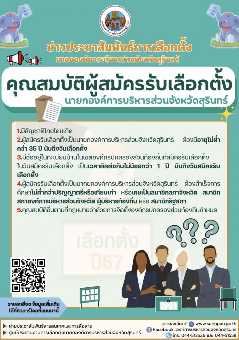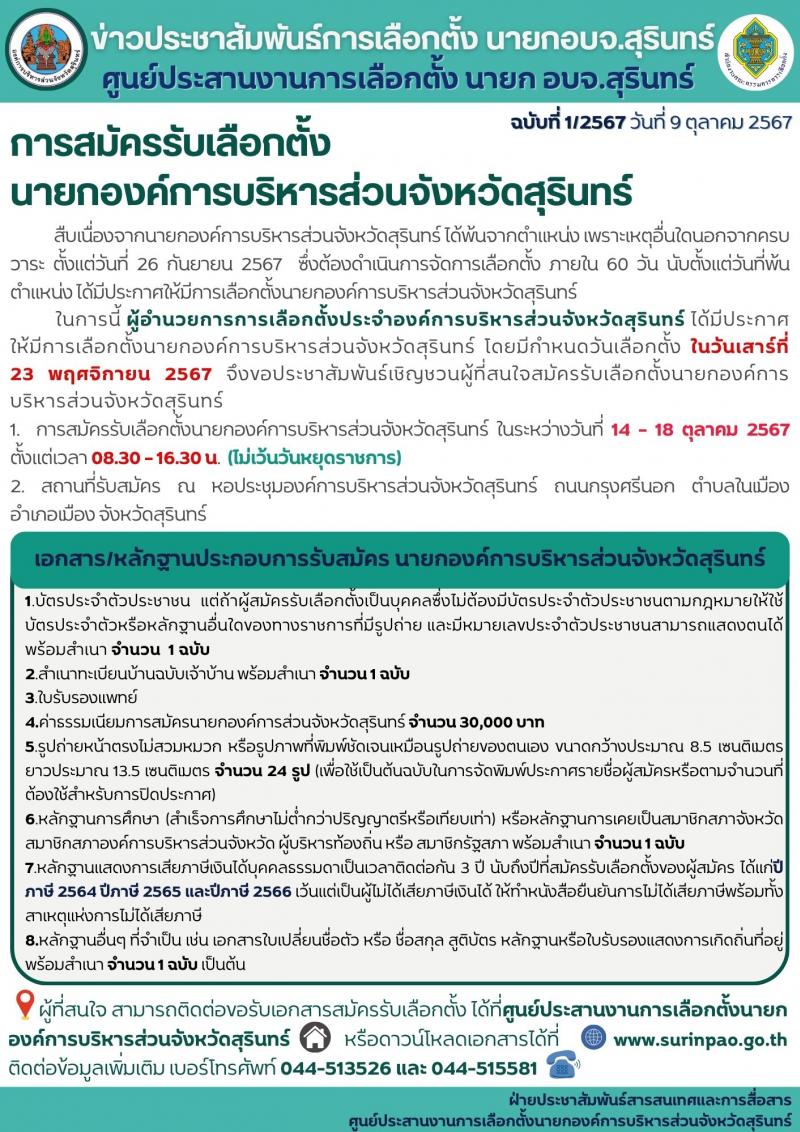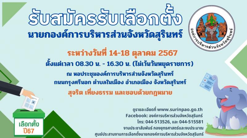 ประชาสัมพันธ์ เชิญชวนไปใชิสิทธิเลือกตั้ง นายกองค์การบริหารส่วนจังหวัดสุรินทร์ วันเสาร์ที่ 23 พฤศจิกายน 2567 เวลา 08.00 - 17.00 น. ณ หน่วยเลือกตั้งที่ท่านมีชื่ออยู่ "ไปใช้สิทธิเลือกตั้ง อย่างสุจริต"