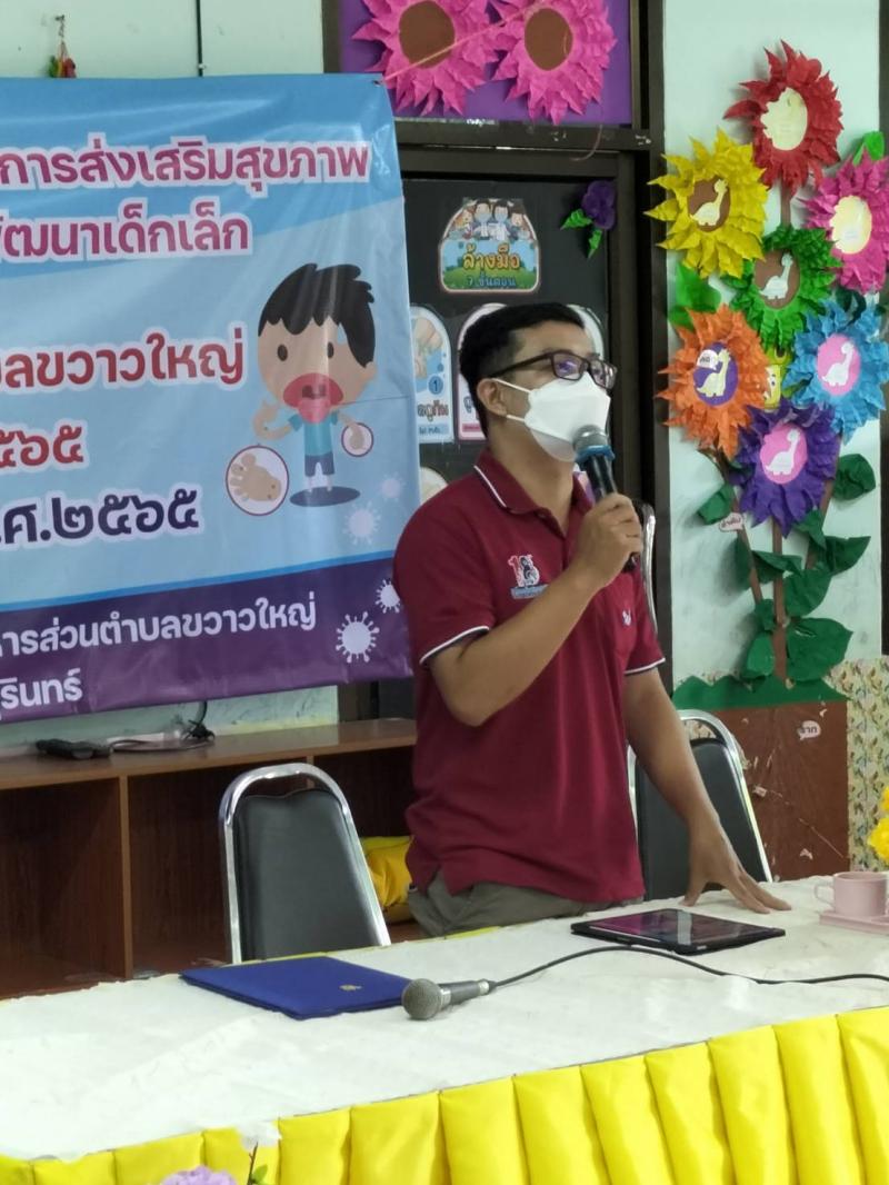 รายละเอียด : โครงการเสริมสร้างความรู้ด้านการส่งเสริมสุขภาพและการป้องกันโรค ในศูนย์พัฒนาเด็กเล็กองค์การบริหารส่วนตำบลขวาวใหญ่ ประจำปีงบประมาณ พ.ศ. ๒๕๖๕ ในวันที่ ๗ กันยายน ๒๕๖๕ ณ ศูนย์พัฒนาเด็กเล็กองค์การบริหารส่วนตำบลขวาวใหญ่ ตำบลขวาวใหญ่ อำเภอศีขรภูมิ จังหวัดสุรินทร์