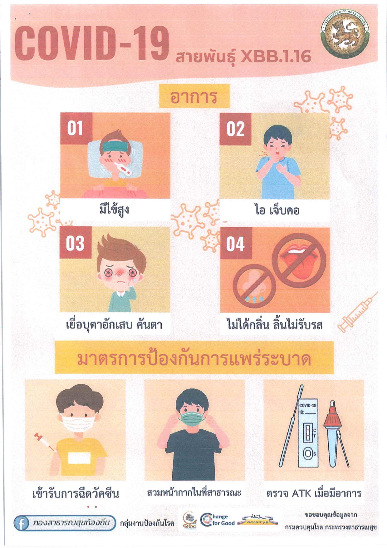 รายละเอียด : ด้วยขณะนี้มีรายงานข่าวการแพร่ระบาดของโรคติดเชื้อไวรัสโคโรนา 2019 (COVID - 19) สายพันธุ์ XBB.1.16 ที่พบเพิ่มขึ้นทั่วโลก โดยพบเชื้อแล้วใน ๒๒ ประเทศ โดยเฉพาะประเทศอินเดีย ซึ่งเป็นสายพันธุ์ที่มีความสามารถในการติดต่อสูงกว่าสายพันธุ์ในอดีต ประกอบกับกรมควบคุมโรค คาดการณ์ว่าหลังเทศกาลสงกรานต์จะพบผู้ติดเชื้อเพิ่มมากขึ้น เนื่องจาประชาชนทำกิจกรรมร่วมกันในช่วงเทศกาลสงกรานต์และการเดินทางที่เพิ่มขึ้น ภายหลังประเทศไทยผ่อนคลายมาตรการ ไม่ได้มีการตรวจโควิดก่อนเข้าร่วมกิจกรรม การสวมหน้ากากน้อยลง จึงทำให้มีความเสี่ยงในการติดเชื้อและทำให้พบผู้ป่วยเพิ่มขึ้นหลังเทศกาลสงกรานต์ได้ และให้ข้อแนะนำประชาชนหลังสงกรานต์ขอให้เฝ้าระวังสังเกตอาการตัวเองอย่างน้อย ๗ วัน ระหว่างนี้หลีกเลี่ยงการสัมผัสใกล้ชิดกับผู้สูงอายุ หรือผู้มีโรคประจำตัวเรื้อรัง สวมหน้ากาก ล้างมือบ่อยๆ เมื่อเริ่มมีกาการป่วย เช่น มีไข้ เจ็บคอ มีน้ำมูก ให้ตรวจ ATK หากผลเป็นบวกให้พบแพทย์ เพื่อเข้ารับการรักษาตามสิทธิและระดับอาการ และสามารถสอบถามข้อมูลเพิ่มเติมได้ที่สายด่วนกรมควบคุมโรค โทร 1422