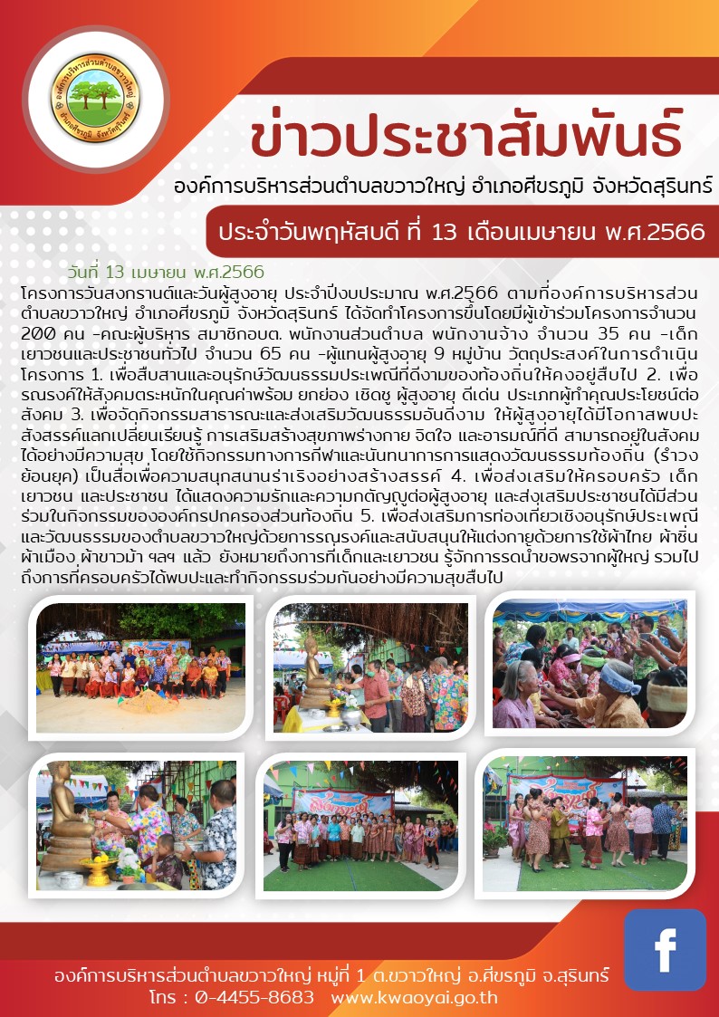 ชื่อเรื่อง : โครงการวันสงกรานต์และวันผู้สูงอายุ ประจำปีงบประมาณ พ.ศ.2566 วันที่ 13 เมษายน พ.ศ.2566 ณ องค์การบริหารส่วนตำบลขวาวใหญ่ อำเภอศีขรภูมิ จังหวัดสุรินทร์