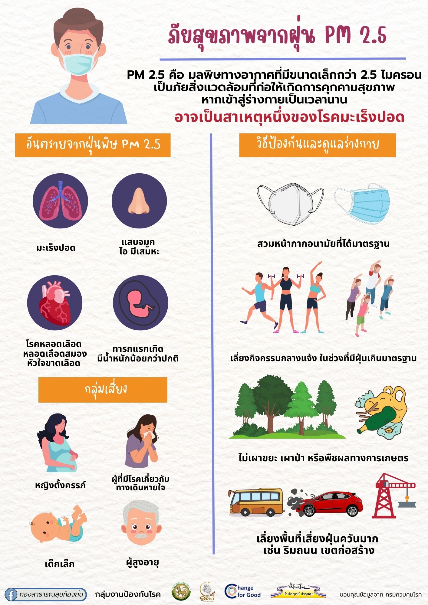 รายละเอียด : ด้วยสถานการณ์ปัญหามลพิษทางอากาศที่มีความรุนแรงมากขึ้นในปัจจุบัน โดยเฉพาะปัญหาฝุ่นละอองขนาดเล็ก (PM 2.5) ซึ่งเป็นภัยสิ่งแวดล้อมที่ก่อให้เกิดการคุกคามสุขภาพของประชาชน หากได้รับเข้าไปในร่างกายจะส่งผลให้มีความเสี่ยงต่อสุขภาพรือก่อให้เกิดผลกระทบต่อสุขภาพ อาจทำให้เกิดอาการระคายเคืองคอ ไอ หายใจลำบาก แน่นหน้าอก ใจสั่น ระคายเคืองตา หรือเป็นผื่นคันตามร่างกายและหากสัมผัสอย่างต่อเนื่อง โดยเฉพาะกลุ่มเสี่ยง ได้แก่ เด็กเล็ก ผู้สูงอายุ หญิงตั้งครรภ์ รวมถึงผู้ป่วย 4 กลุ่มโรคสำคัญที่ต้องเฝ้าระวังคือโรคหัวใจและหลอดเลือด โรคระบบทางเดินหายใจ โรคผิวหนังอักเสบ และโรคตาอักเสบ อาจจะมีอาการผิดปกติ เจ็บป่วย หรือมีผลกระทบต่อสุขภาพที่มีความรุนแรงได้มากกว่าคนทั่วไป
