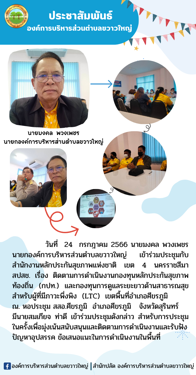 รายละเอียด : เข้าร่วมประชุมกับสำนักงานหลักประกันสุขภาพแห่งชาติ เขต 4 นครราชสีมา สปสช. เรื่อง ติดตามการดำเนินงานกองทุนหลักประกันสุขภาพท้องถิ่น (กปท.) และกองทุนการดูแลระยะยาวด้านสาธารณสุขสำหรับผู้ที่มีภาวะพึ่งพิง (LTC) เขตพื้นที่อำเภอศีขรภูมิ